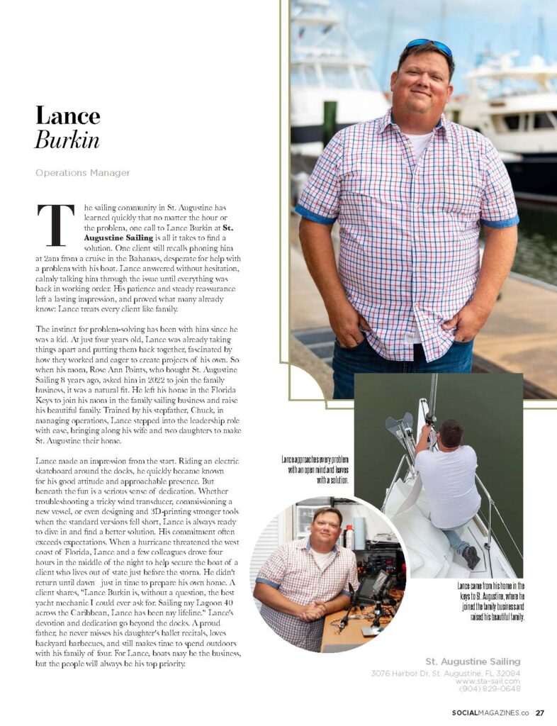 Lance made an impression from the start.  Riding an electric skateboard arond the docks, he quickly became known for his good attitude and approachable presence.  But beneath the fun is a serious sense of dedication.  Whether troubleshooting a tricky wind transducer, commissioning a new vessel, or even designing and 3D-printing stronger tools when the standard version feel short. Lance is always ready to dive in and find a better solution.  His commitment often exceeds expectations.  When a hurricane threatened the west coast of Florida, Lance and a few colleagues drove four hours in the middle of the night to help secure the boat of a client who lives out of state jut before the storm.  He didn’t  return until dawn – just in time to prepare his own home.  A client shares, “Lance Burkin is, without a question, the best yacht mechanic I coul ever ask for, Sailing my Lagoon 40 across the Caribbean, Lance has been my lifeline.”  Lance’s devotion and dedicaiton go beyond the docks.  A proud father, he never misses his daughter’s ballet recitals, loves backyard barbecues, and still makes time to spend outdoors with his family of four.  For Lance, boat may be the business, but hte people will always be his top priority.